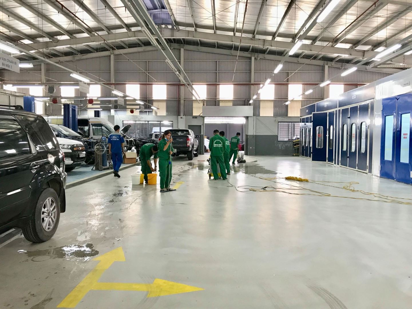Làm sạch mặt sàn: Sử dụng máy móc công suất mạnh để hút sạch mọi loại bụi bẩn, hóa chất và dầu mỡ. Dung dịch tẩy rửa được chọn lựa kỹ càng dựa trên chất liệu nền, đảm bảo làm sạch hiệu quả mà không gây tổn hại.